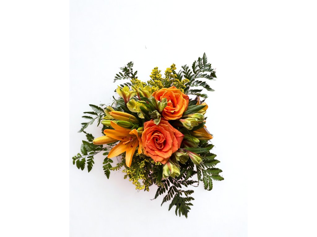 Zářivá kombinace 2 růží, alstromerie, lilie, solidaga a zeleně rumora, která evokuje teplý paprsek slunce i v zamračený den. Ideální volba pro chvíle, kdy chceš někomu vykouzlit úsměv a vnést do života trochu světla a radosti.